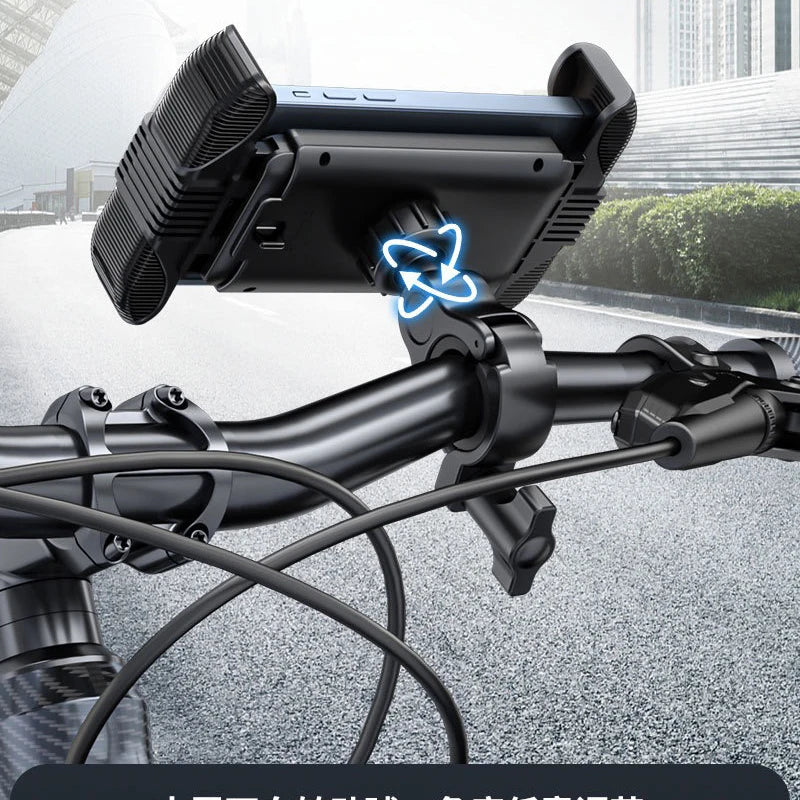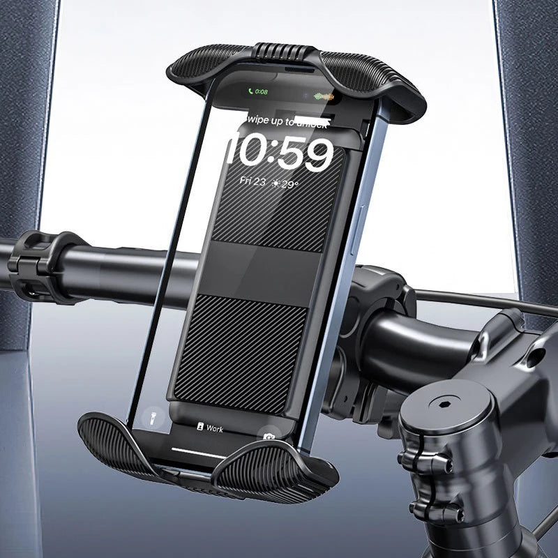 Universal bike and motorcycle phone holder compatible with iPhone 15 Pro Max/Plus and other smartphones. Designed for easy installation on handlebars with 360° rotation for optimal viewing. Ideal for bicycles, scooters, motorcycles, and GPS use.