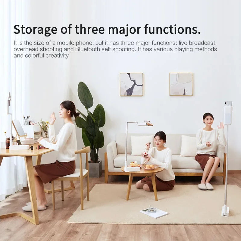 This is a brand new foldable, portable, multifunctional phone holder with fill light for selfies, tripod, Bluetooth remote camera control, and desk lamp functions. The foldable and portable design makes it perfect for daily photography, video calls, and live streaming.