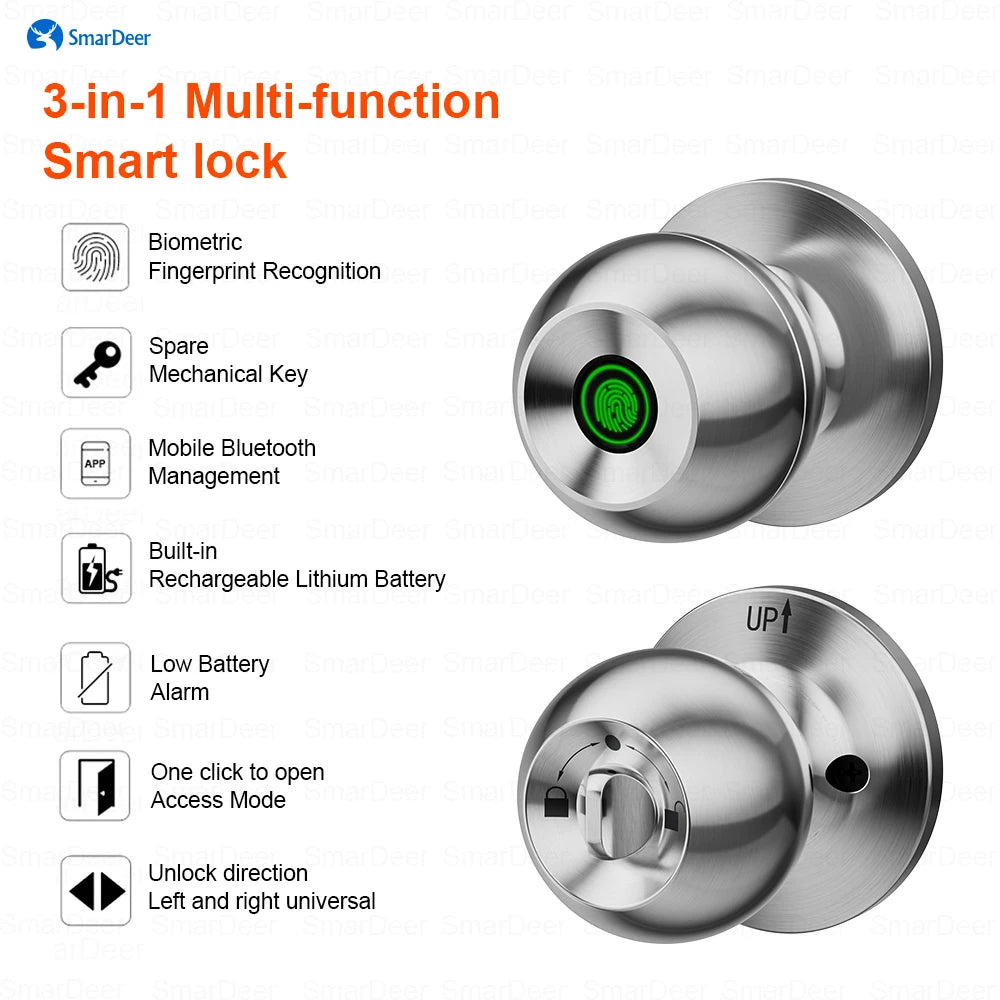 ontrol locking and unlocking via Bluetooth. Remote unlocking and management require a connection to the smart gateway.The fingerprint sphere lock features an integrated biometric fingerprint sensor with high recognition speed and accuracy. It supports up to 20 fingerprint IDs for unlocking.