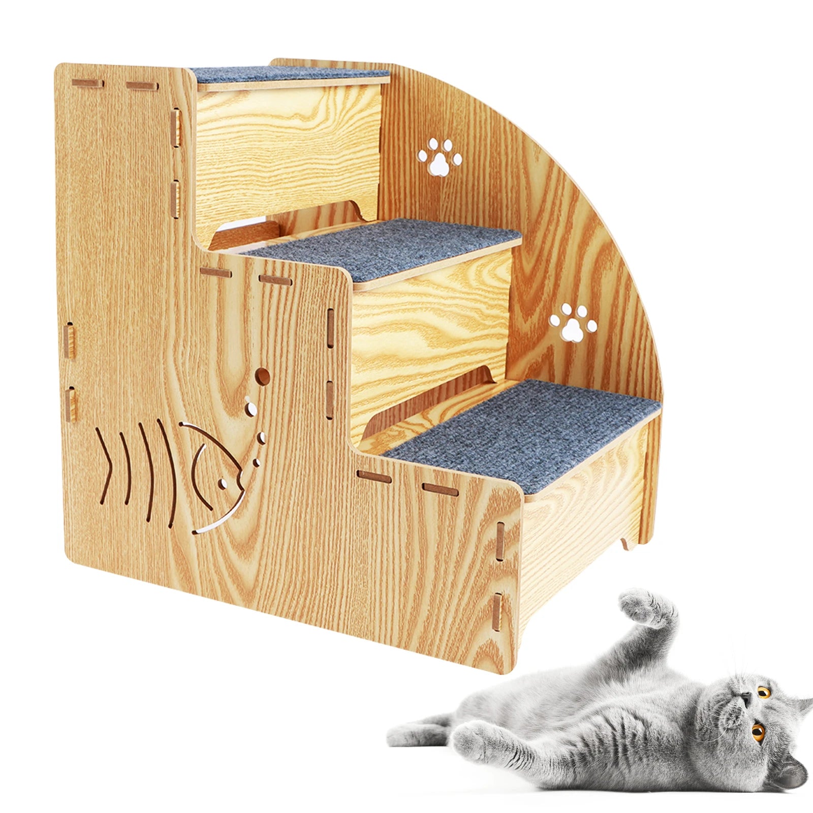 ✅ Non-Slip and Durable – Unlike foam alternatives, this wood stair system is firm and long-lasting. Each step is lined with soft, textured carpet fabric for better grip and paw protection.
